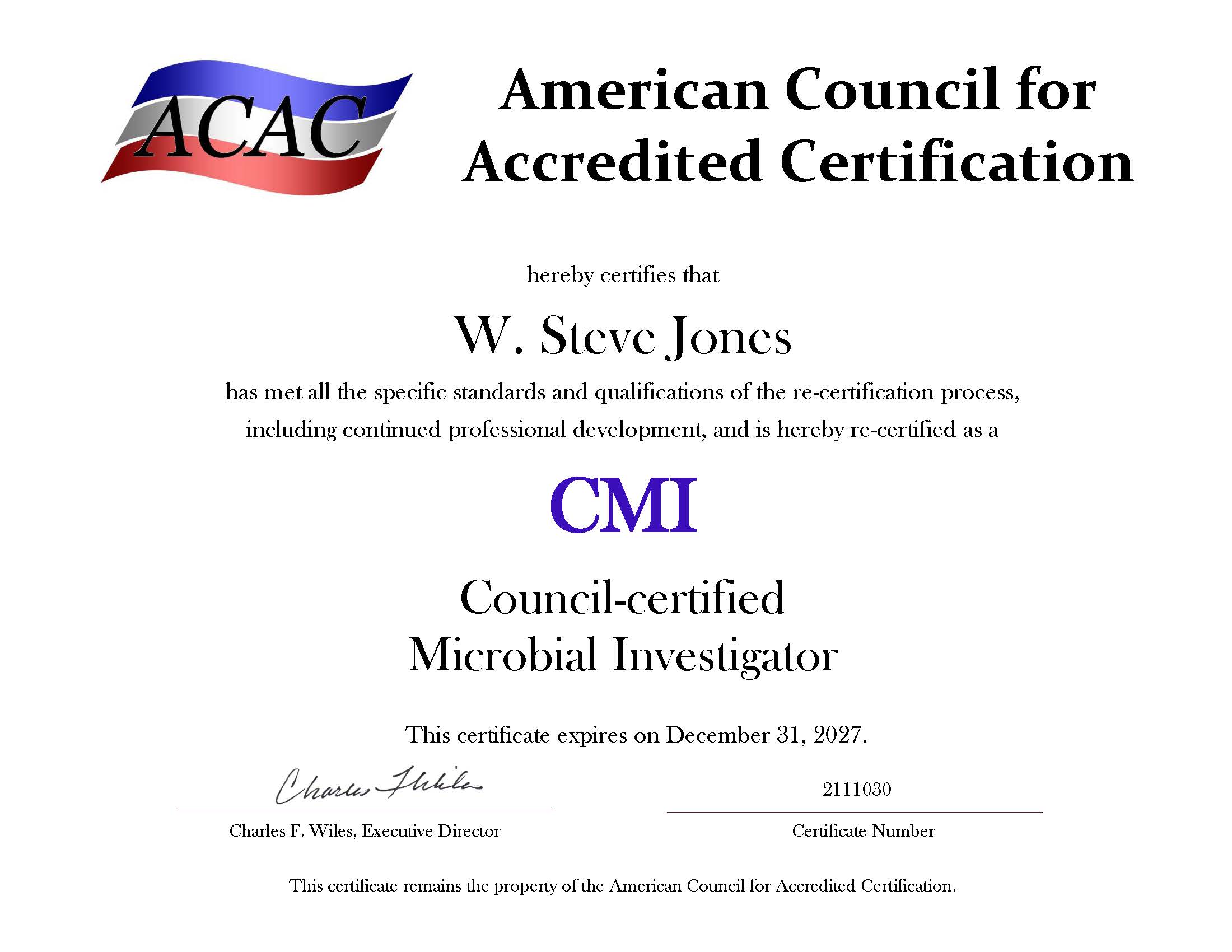 The ACAC (American Council for Accredited Certification) hereby certifies that William "Steve" Jones has met all the specific standards and qualifications of the certification process and is hereby certified as a CMI (Council-Certified Microbial Investigator).